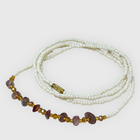 Sublimez votre taille avec ce baya délicat, agrémenté de véritables perles de Quartz Fraise, pierre d’amour et de joie de vivre.